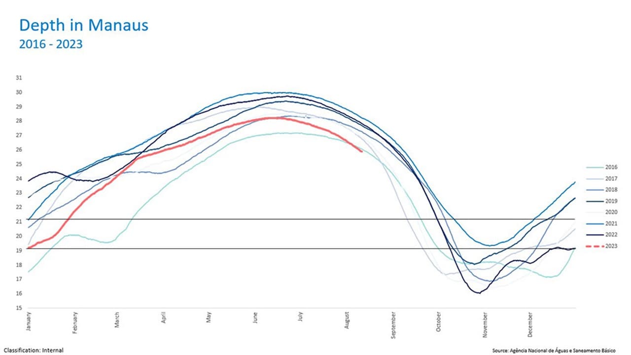 Based on the data recorded by the Brazilian National Water Agency (ANA) gauges and the continuous analysis of the receding trend in the Amazon region, we have identified a decrease in the depth of the Amazon River. This indicates that there may be a restriction on the draft of ships during the dry season, which historically lasts for approximately 120 days between September and December.